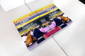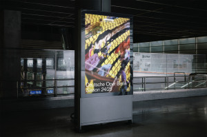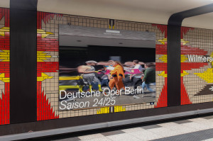 The photos were taken, among other places, in the auditorium with the yellow seats, in the stairwell that can be seen through the facade and on the exposed concrete wall at the main entrance on Bismarckstraße. The campaign for the 24/25 season is our third for the Deutsche Oper using digital and AI-based tools to create motifs with a special visual language.