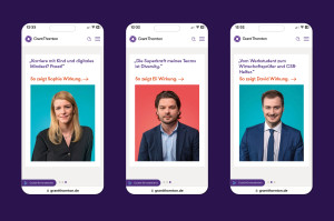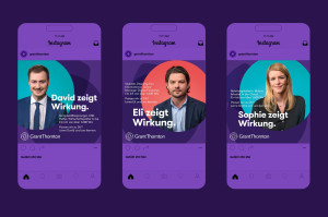 The first phase of the campaign briefly introduces the company’s values and then changes perspective: Grant Thornton makes its own application to potential applicants and asks the question: ‘Are we right for you?’ In the second phase, we let real employees have their say in video testimonials. On camera, they talk about the impact their work has internally and externally. The perspectives could hardly be more different: from a senior manager who advocates for diversity to a single mother who runs a department and a sustainability expert who has made a conscious decision not to work for an NGO.